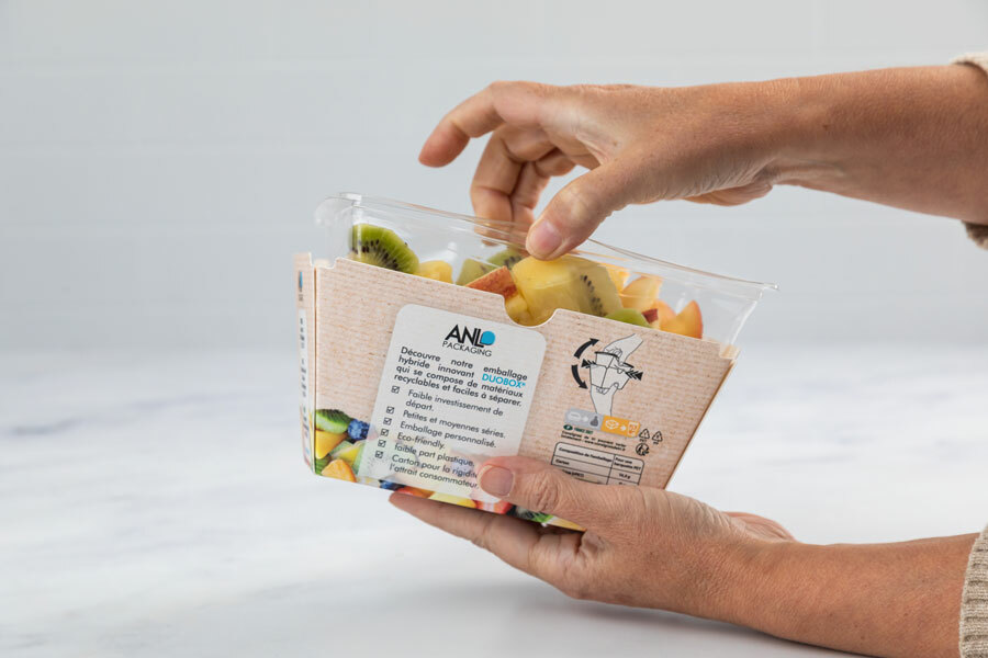 Damit kommt die Duobox mit bis zu 50 % weniger Plastik aus und bleibt dank der Kartonummantelung dennoch stabil. Da sich die Kartonummantelung leicht entfernen lässt, ist sie bequem zu nutzen und zu entsorgen. Der Karton kann außen bedruckt werden, damit Ihr Produkt im Regal auffällt. Natürlich kann auch die Innenseite bedruckt werden, beispielsweise mit Tipps für die Zubereitung des Produkts und die Entsorgung der Verpackung.