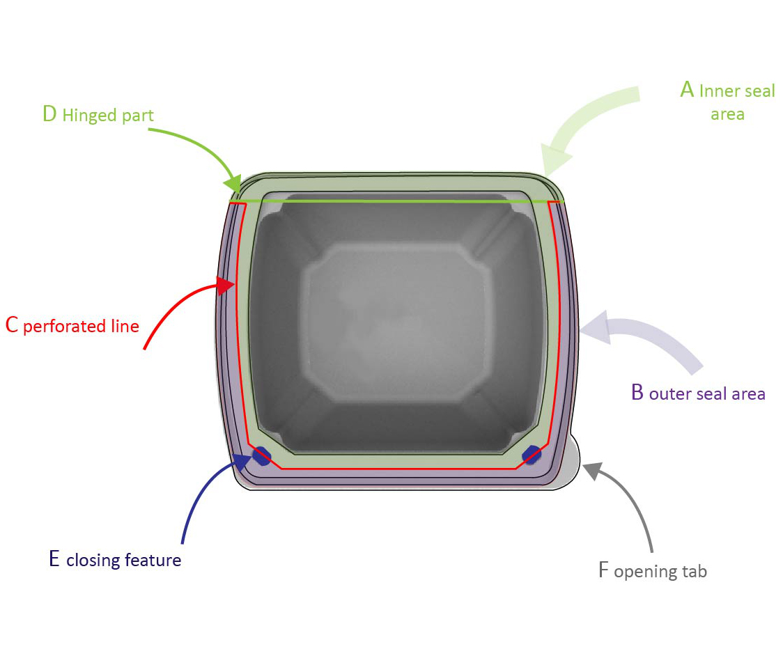 Het deksel en de seal vormen één geïntegreerde eenheid, die in één enkele stap aan het schaaltje wordt bevestigd, zodat het deksel gemakkelijk met het klik-en-sluitscharnier kan worden geopend en gesloten. De seals zijn aan de folie en het deksel bevestigd, zodat de sealfolie bij hersluiten en heropenen strak blijft zitten.